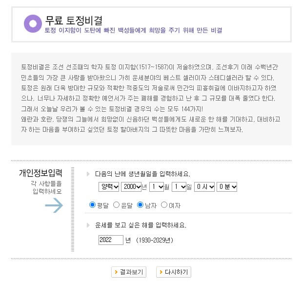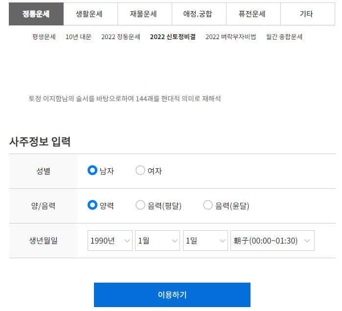 성별과 생년월일만 알면 신년운세와 토정비결을 확인할 수 있습니다.